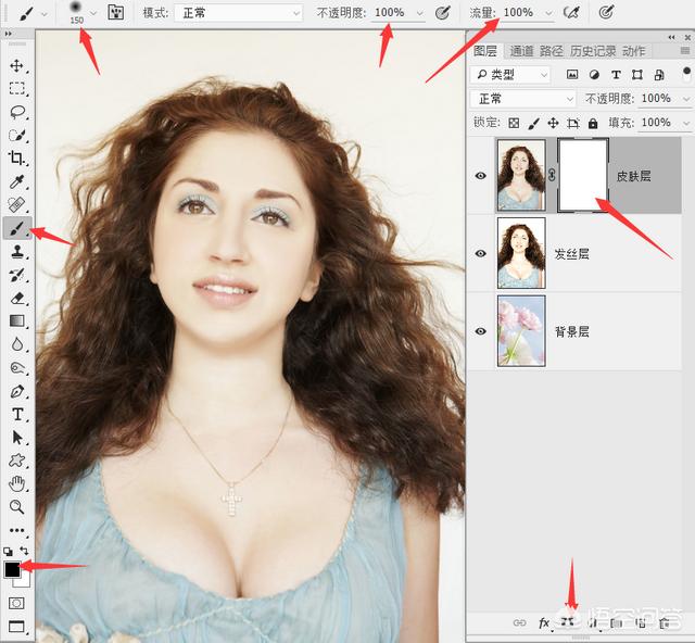 11.选中蒙版部分,用画笔去擦除第一层所有白色背景区域,注意当擦到头发时候要仔细一些,尽量不要往里擦的太多,可以使用画笔边缘去轻轻扫过。靠近人物皮肤的部分一定更加仔细,不要擦到皮肤哦!