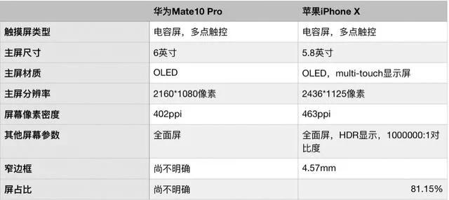 屏幕方面,双方都采用了OLED屏幕,但是iPhone X的对比度高达1000000:1,HUAWEI Mate 10 Pro只有70000:1。