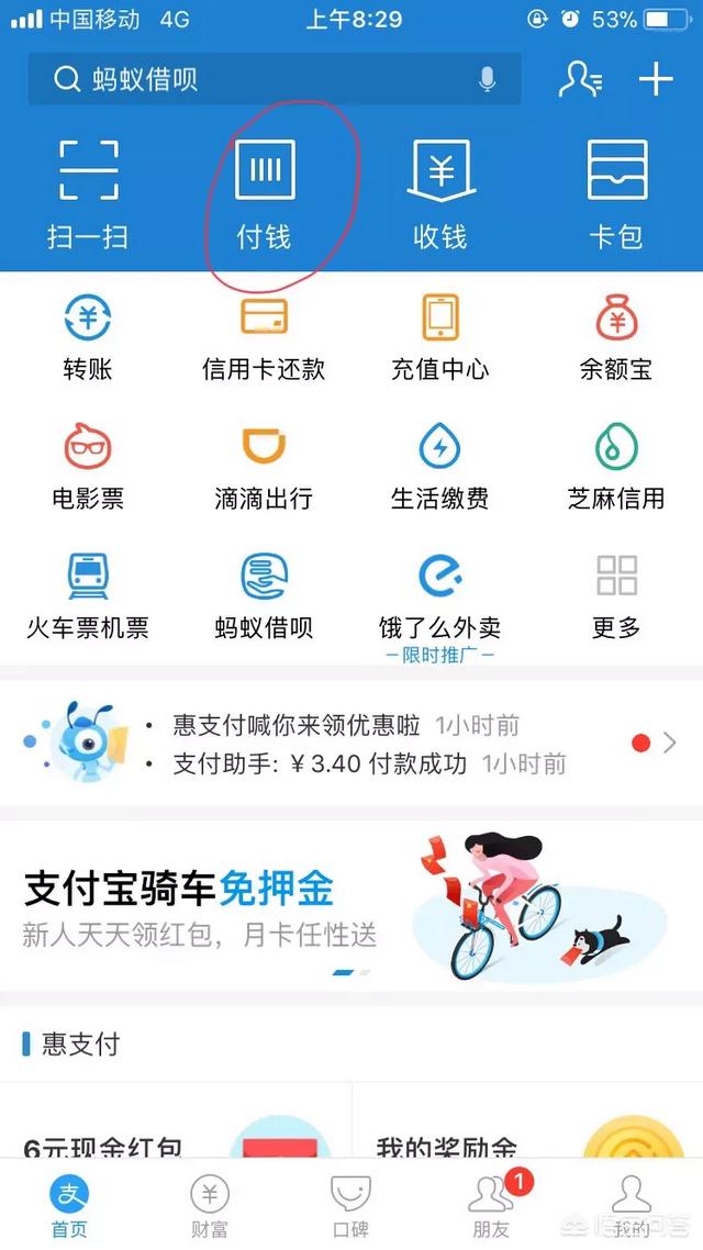 2.大型商场,超市,可能会有另一种支付宝支付方式,需要出示你的二维码,他们用自己的扫码机扫码进行支付活动。你只需点击下图红线圈中的图标即可。