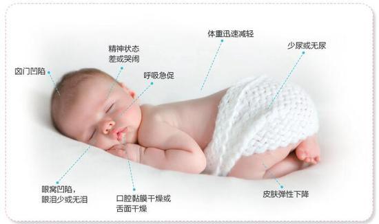 当宝宝出现急性腹泻、呕吐等时,很容易因此引起脱水。宝宝脱水的临床表现为: