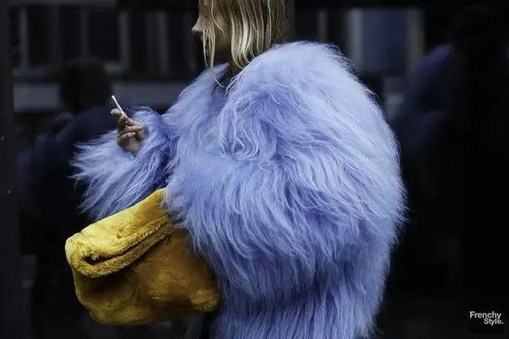 明亮的姜黄色皮草包包和天蓝色皮草外套搭配,走在路上绝对回头率百分百!