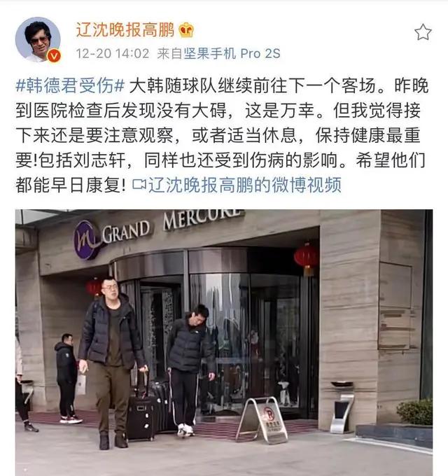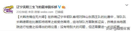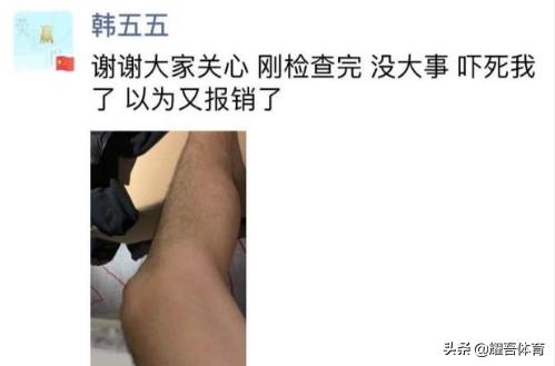 赛后郭士强在接受采访时,当被问及韩德君伤势的时候,他表示:“目前还不知道情况,会让队医或者去医院检查一下”,这不免让大家比较担心,运动员最怕伤病,一旦受伤严重,就要面临停赛,这对于球员本人和球队都是十分不利的,大家也开始挂念起大韩的伤势,还好最终我们得到的是好消息,俱乐部方面表示:昨晚去当地医院检查后得出结论是:没有特别大的问题,但还需要进一步观察,而韩德君也在自己的社交媒体上说明了自己的伤势没有大事,这样终于让球迷心里踏实了,只是虚惊一场。