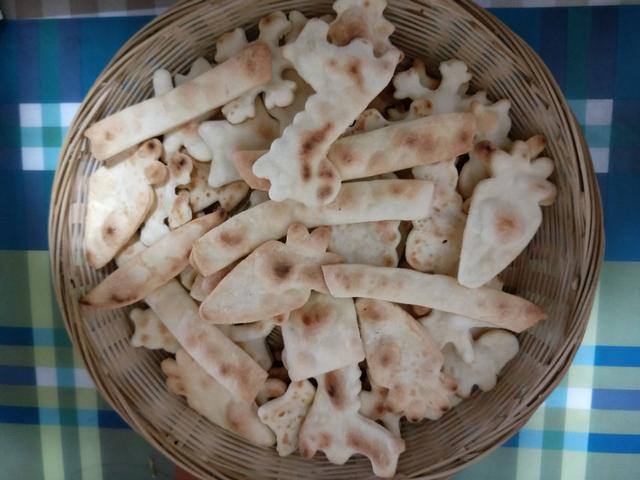 10~12个月,这个时候我家宝宝已经长出6颗牙齿了,因此我们需要锻炼她的咀嚼能力和动手能力,饮食也要做相应的调整。因为家中没有烤箱,我先生就用电饼档、打蛋器、饼干模具为宝宝做了可爱的磨牙饼干。宝宝每天吃两顿辅食,饮食上也不再追求软烂,蔬菜、肉类都尽量切成条状,让她学会用手抓着吃。
