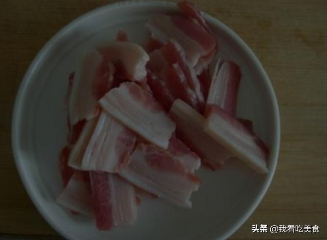 第一步:五花肉表皮清洗干净且没有毛,随后将其切成大的薄片,备用。