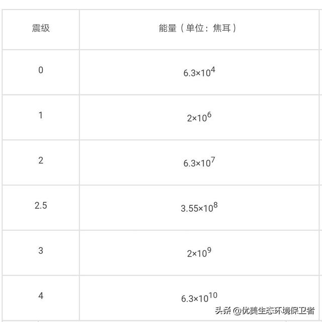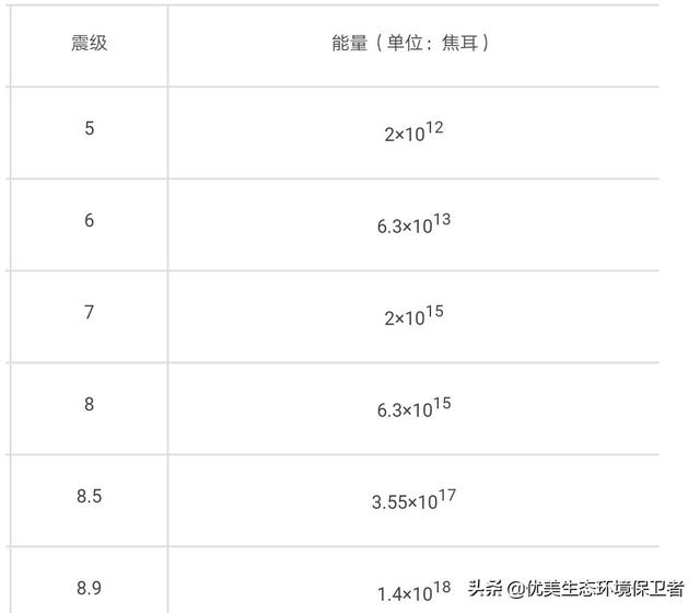 作为对比,里氏5级地震释放能量为2.0*10^12J,6级地震释放的能量为6.3*10^13J (数据来自百度百科,本人不对其正确性负责,仅供参考)。