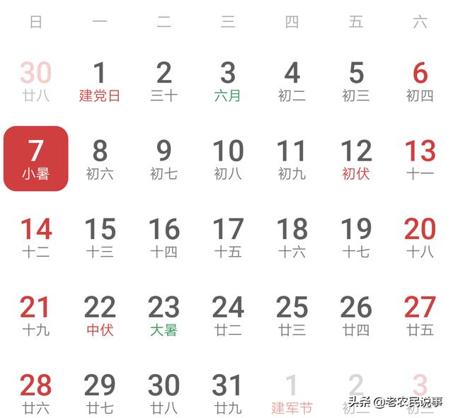 今天是阳历7月7日,恰好是小暑,7月12日是头伏的开始,而中伏的起始在7月22日,大暑在7月23日,一年之中最热的时候都集中在中伏里面,所以头伏之前的小暑确实不算热,而大暑落在中伏天里面,所以正儿八经热起来的日子还是在大暑以后,才能称得上真正意义上的伏天。