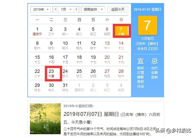 而至于小暑和大暑节气哪个更热,其实在气象统计数据上的确有过统计,根据1971年~2000年的国内气象数据统计,国内最高气温出现时间在大部分省份是出现在8月上旬,只有一部分省份会出现在7月下旬!而历年大暑节气出现时间为7月22~24日,又处于中伏期间,这样一来,说明国内大部分地区会在大暑节气后迎来当地气温最高值,所以说“大暑是伏天”也是非常有道理的,与现代气象科学统计数据论证的结果相差不大!
