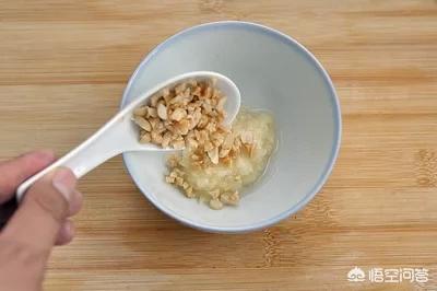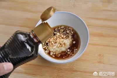 4、把熟花生碎倒入蒜泥碗里,倒入适量生抽,加一汤匙凉拌醋,调匀,最后加少许香油,调匀即可;