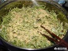 一次不要加太多可以分多次加入,用手把面粉和菜拌匀,保证它们都均匀的裹上面粉。为了保持菜的色泽嫩绿,可以往里面加一点点碱面。最后拌到这种程度就可以了。锅中水烧开,大火蒸15分钟。