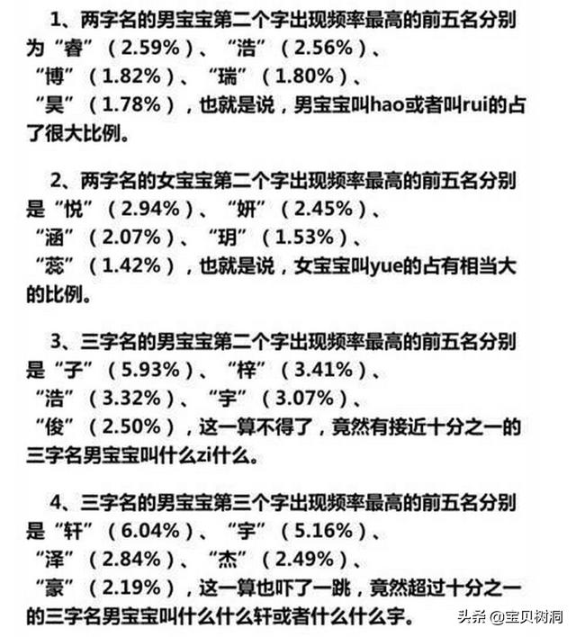 五六十年代的“建军”、“建国”、“国庆”、“文革”、“抗美”等就是活生生的实例,孩子们的一生都被打上时代的政治烙印。也不建议从偶像剧、言情小说里取名字,有点矫揉造作的赶脚。这里的时髦还指网上百度一些所谓大神整理的自认为很优雅的名字,像“伟”、“子”、“梓”、“涵”、“睿”、“轩”、“萱”、“哲”已经被滥用了,一抓一大把。我在附图里有提及名字重复概率,可自查。以下需要注意(希望不要得罪太多人):男名A类:财、富、发、生、根、球;男名B类:利、胜、东、军、兵、刚、强、力、明、波、鹏、飞、帅、宁、阳、洋、辉、亮、杰、华、鑫、浩、平、峰、民、超、祥、涛、伟、龙、建;女名A类:花、红、艳、丽、美、妹;女名B类:萍、倩、娜、琳、玲、欣、露、雯、丹、芳、莉、静、慧、娟、玉、英、颖、梅、敏、莎、霞、妍。(请注意,以上总结不全面。)这里面A类字是要坚决避免的,无论单名还是双名包含了这类字,都算不上好。B类字避免单独出现,最好与别的字组合起来以达到不再俗气的效果,当然要避免鹏飞、红梅、艳丽这样的“菜市场”名字。