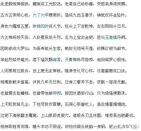 我们看一下原文:此是锻炼神冰铁,磨琢成工光皎洁。老君自己动钤锤,荧惑亲身添炭屑。五方五帝用心机,六丁六甲费周折。造成九齿玉垂牙,铸就双环金坠叶。身妆六曜排五星,体按四时依八节。短长上下定乾坤,左右阴阳分日月。六爻神将按天条,八卦星辰依斗列。名为上宝沁金钯,进与玉皇镇丹阙。