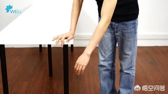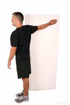 把后手放到墙面胸部高的位置,保持手臂伸直。
