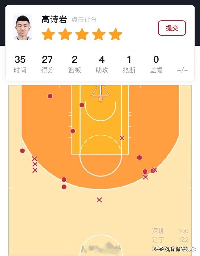 在第一节高诗岩三分线外频频命中,单节6投6中得到了16分,而辽宁队在首节结束也恰好领先深圳队16分。可以说是高诗岩在首节的发挥奠定了本场比赛辽宁队能够取胜的基调!