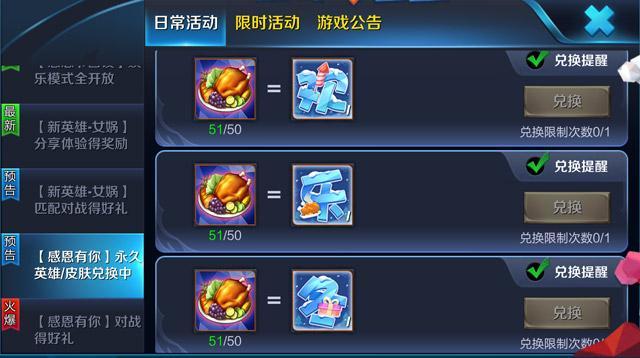 王者荣耀明日(11月23日)开启【感恩有你】永久英雄/皮肤兑换,共有13个英雄或皮肤可以兑换,每个英雄或者皮肤兑换都需要50个感恩节美食(通过每日登录、每日对战、指定英雄对战来获取感恩节美食),而就算将所有任务做完,每天都有登录,每天都有对战,最终也只能获取18+16+4*13=86,也就是最终只能兑换某一个英雄或者一个皮肤。