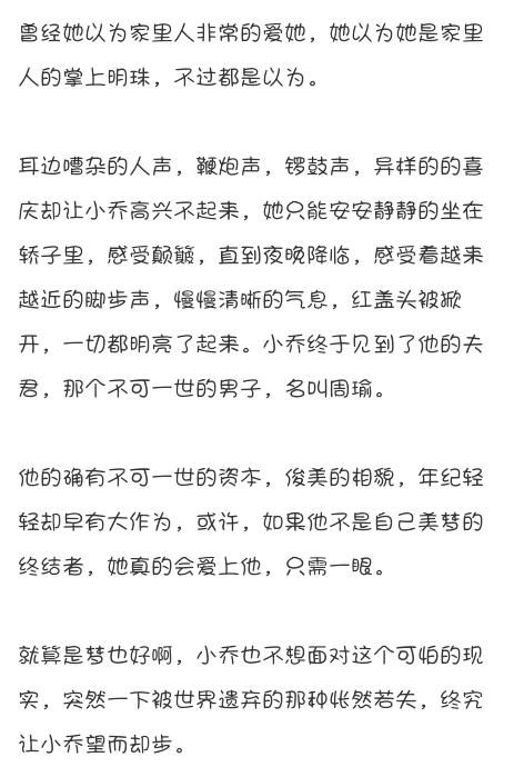 “啊!”小乔一个趔趄,从梦中醒来。“啊呼,啊呼……”她紧张地深呼吸着。这是她来到周府的第一天。