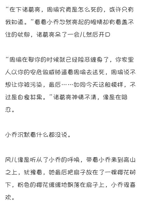“乔莹……”周瑜看着这从小的玩伴,咽了口唾沐,心一恨,举起剑,朝她刺去。