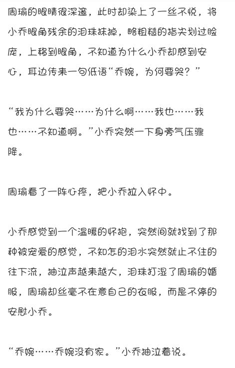 而周瑜呢也乐的去做,每一次做好一件事都要抱一下小乔,过了这么许久,小乔和周瑜早已躺在了床上(下面请自行脑补)