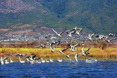 拉市海水草肥美、湖色优美,被誉为生命的摇篮,是美国大自然保护协会基地。拉市海由季节变成了保持一定水位的高原湖泊,如镜的湖面倒映着玉龙雪山,越冬水鸟安然栖息,或翱翔于蓝天白云之间,构成高原湿地特有的气息。拉市海是骑马划船经典之地。