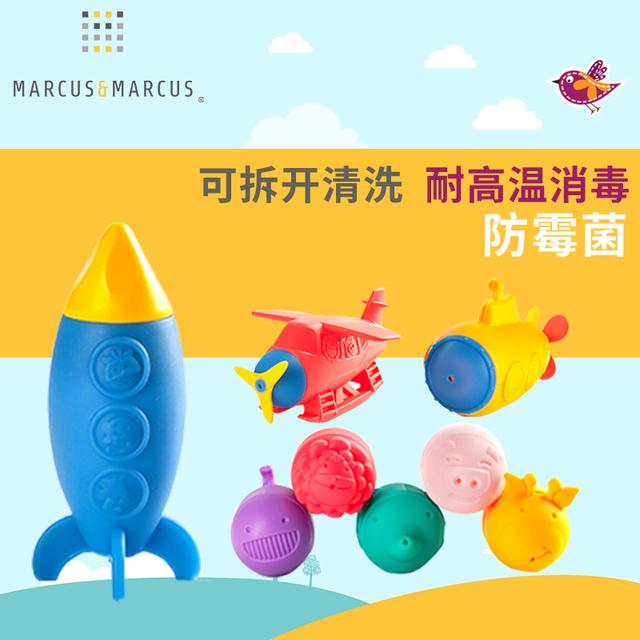 加拿大MARCUS&MARCUS硅胶洗澡玩具,使用安全无毒食品级硅胶,不含双酚A、聚氯乙烯和邻苯二甲酸,铅等有害物质,材质非常柔软。能过EN71检测,它们与普通材质洗澡玩具不一样,可以拆开用高温消毒后放在通风处可自然风干,解决了因为普通洗澡玩具由于密封导致发霉,发臭等等不卫生的问题,让宝宝更放心的使用。 鲜艳的颜色更能吸引宝宝,拆开后灌满水,轻轻挤压,头部就会喷水,松开手,停止喷水,让宝宝爱上洗澡。此款产品还加了感温功能,可做测量水温用,温度过高火箭身会变色,可防止水温过高而烫伤宝宝。