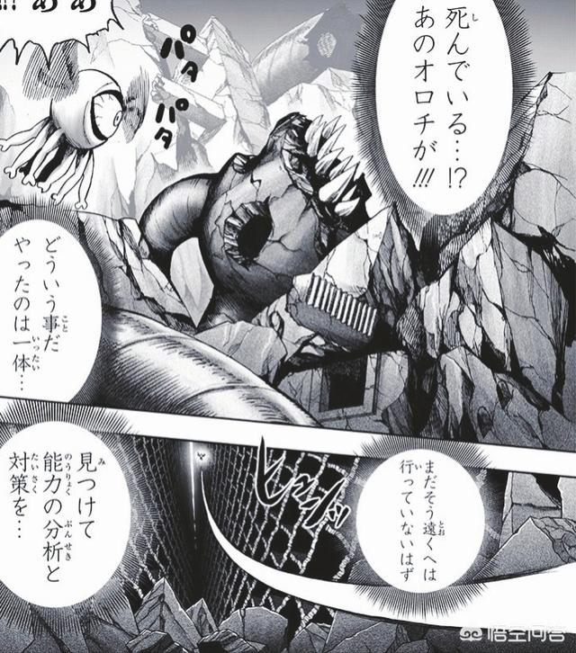 我们看到的故事展开就是通过大炯眼的分身,在它被龙卷完虐的时候一直忙于搜寻怪人王大蛇的下落,因为它并不相信会存在比自己的性命更高级别的警戒强敌!希望大蛇能赶到现场来帮助自己,终于经过千辛万苦,终于找到了,但没想到看到的竟然是大蛇的残骸,大炯眼的口吻是认定了大蛇彻底的凉凉了,但是要是从观众角度来看,只能够说怪人王大蛇复活的可能性极低,但是还是存在反转的极小可能性的!