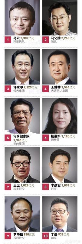 按照2018年福布斯富豪榜,紧随马云身后的就是马化腾和许家印等人。其中马化腾和许家印分别以2263亿元和2125亿元的财富位居中国第二、三位。