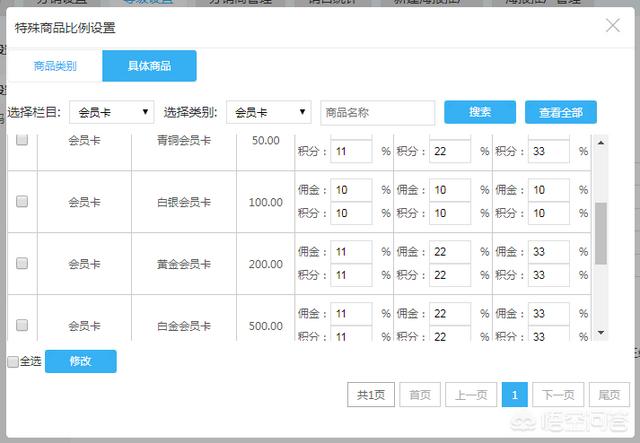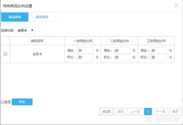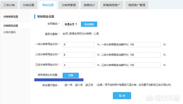 在分销等级设置中,设置“特殊商品佣金比例”并选择栏目“会员卡”功能。