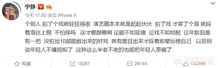 午时,素以直爽敢言闻名娱乐圈的宁静忽然发了一条微博,称某略有年纪的演员太轻狂,戏剧成绩不咋地但踩着前辈往上爬。
