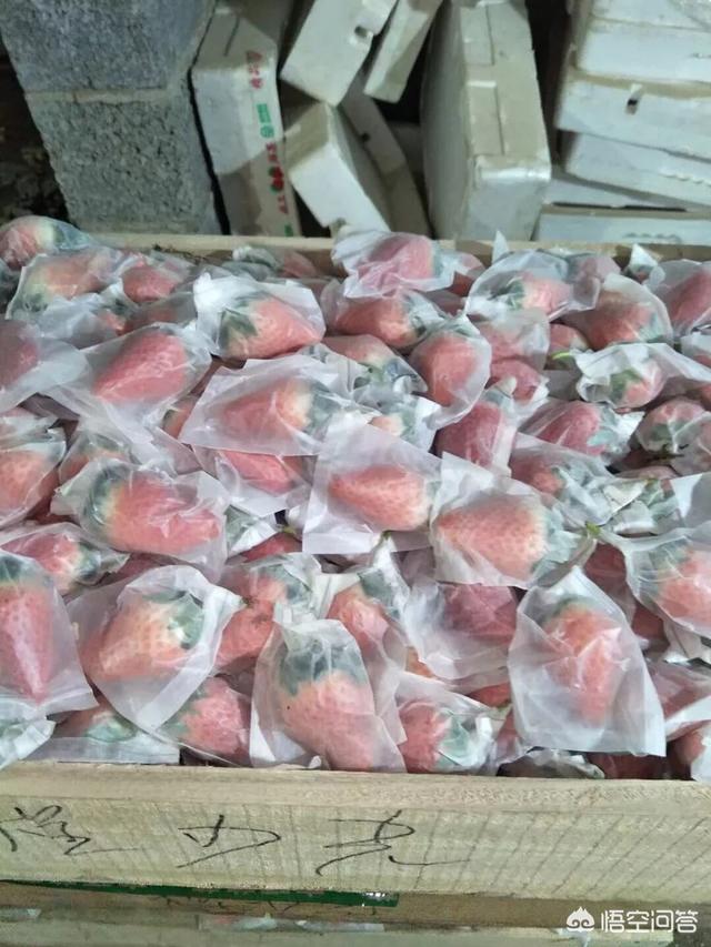 现在我们这里很多草莓园都对草莓进行套袋了。套袋后的草莓不仅生长环境更加绿色,而且纸袋内的温度还能使草莓个头更大,颜色更艳。