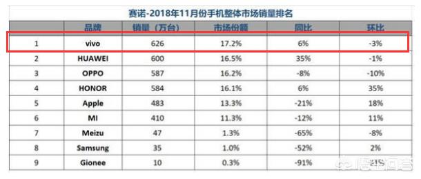 我们先看一张统计图:这是赛诺2018年11月份手机整体市场销量排名,其中vivo手机以626万台的成绩获得了第一,市场份额占据17.2%,在全国手机行业中,排名第二,仅此于华为手机。这张图我只想带大家了解下,消费者对于vivo手机的青睐,还是有加的。