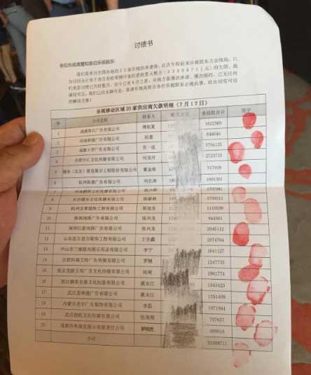 据现场人士透露,讨债人士情绪都很激动,在门外各种大声嚷嚷。这些讨债者还集体签署讨债书,分别由供应商名称,联系人,大家留下电话,并按下手印。