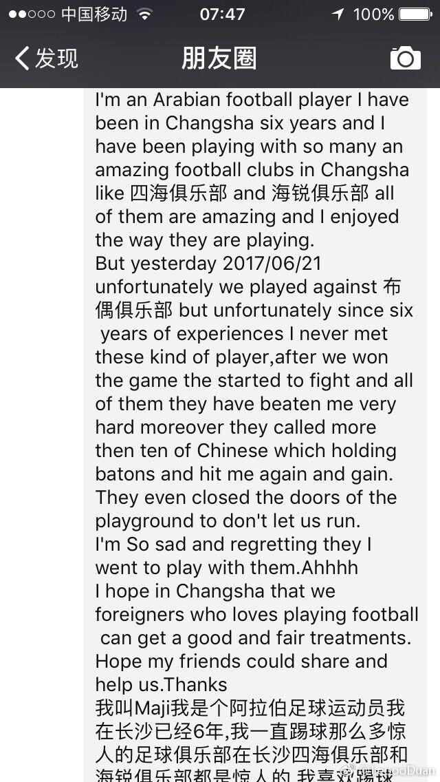 该外籍球员在朋友圈叙述的事件经过随后也被转载到了网上,“我是一位阿拉伯球员,我们和布欧俱乐部的比赛之后发生了不幸,我从未遇到过像这样的球员,当我们获胜后双方发生打斗,他们又叫来了10多个人来打我们,出手非常重,而且还是用棍棒类器械,不断击打我。为了不让我们逃跑,他们甚至把球场的门锁了起来。”此外,该外籍球员被打受伤的照片也被传到了网上。