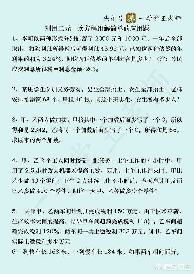 建议你好好巩固下一元一次方程组知识点。学习任何知识点都是一样的,学会了就要去多用,多接触不同题型。下面分享两个例题及练习题,供您参考!我是王老师,致力于数学方面的新农商网!