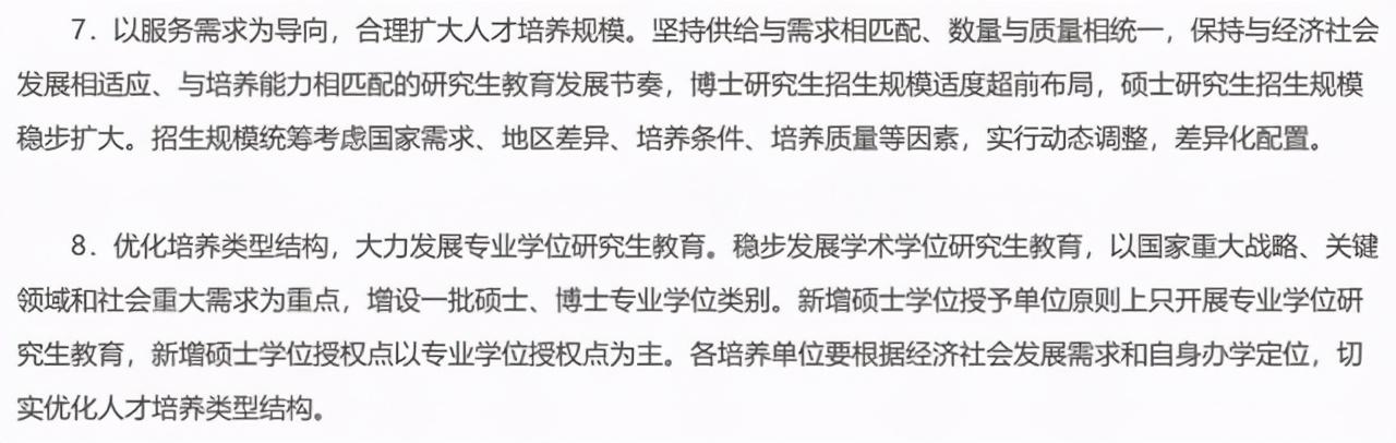 比如《关于加快新时代研究生教育改革发展的意见》中就明确提到要硕士研究生招生规模稳步扩大,以国家重大战略、关键领域和社会重大需求为重点,增设一批硕士、博士专业学位类别。新增硕士学位授予单位原则上只开展专业学位研究生教育,新增硕士学位授权点以专业学位授权点为主。