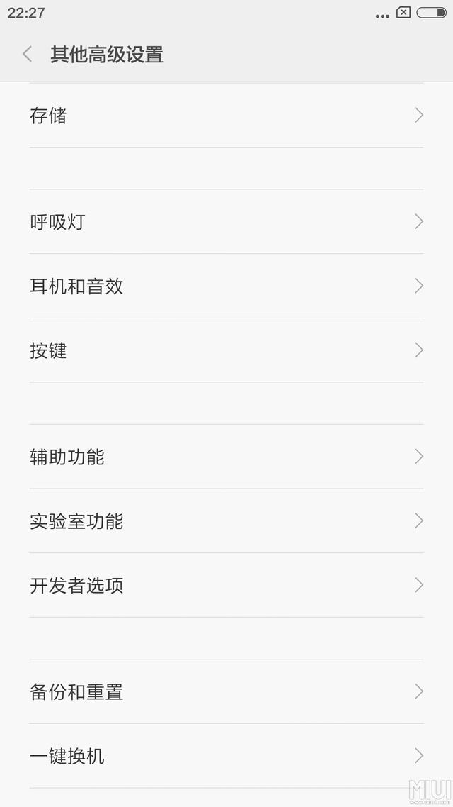 当然这不是唯一的入口,也可以点击设置->其他高级设置,在这个页面的最下面与备份在一起的栏目中也能够找到一键换机