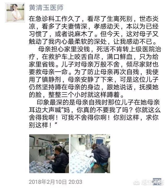 一个医生的一段话:在急诊室工作久了,看尽了生离死别,世态炎凉,看多了夫妻情深,孝感动天,本以为已经习惯了,或者麻木了。但今天,这对母子又触动了我内心最柔软的深处,让我感动不已。