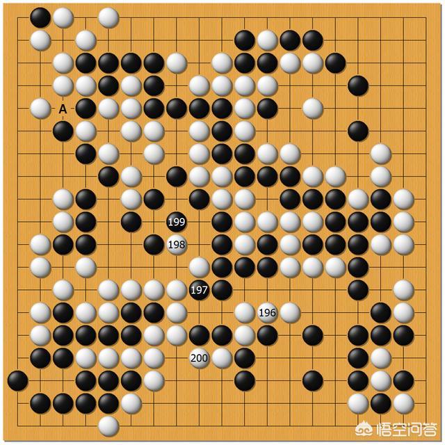 白200是第二个关键的选择点,此时白棋已经可以在A位提劫了,全盘是优势,大概65%胜率,但柯洁认为可以全杀黑棋!所以白200把黑棋大龙卷进来,赌上自己的龙和以劫对杀。