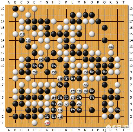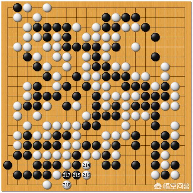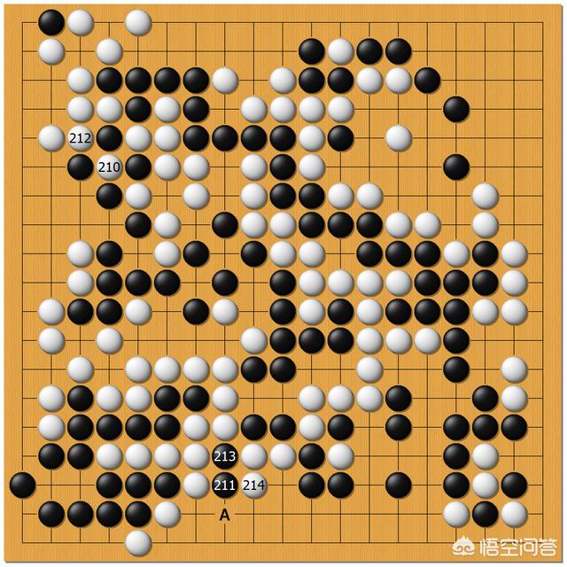 又是一通劫财,白棋最终还是210、212提通了,黑棋也找到了211、213的本身劫救回了大龙,虽然全局形势已非。