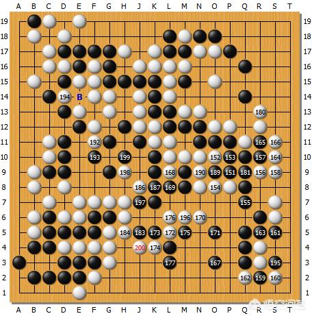 黑179提劫,白180找劫,双方开始打劫。黑劫材明显不利,只好195吃右下角,意思是让白196在C15消劫,双方收官。但是本局柯洁状态不错,不接受妥协方案,而是接在196,再200断开黑中央大块,双方两大块在中间上演激情打劫大对杀!由于手数太长,这也是AI不会选的方案,但是人类高手却更愿意下的。