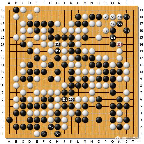 黑下面的劫必须打胜,不然全死了。所以白226断的劫材黑不能应了,只能227消劫。但是白228长出后,黑左上角崩溃了,至236,黑两边必死一边,只得投了。