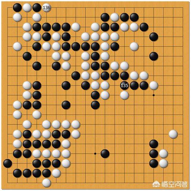 范蕴若执黑,柯洁执白。第一个关键的选择点在这里,黑135接住,威胁中腹白龙,这是劫财。可白136直接不理,在左上消劫,以大龙生死决胜负。