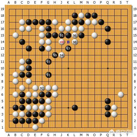 柯洁74先考验黑一下,82扳又是同样的招数,体现了柯洁灵活的棋风,黑如果应不好就会被白占得上风。但白84尖虎不好,范蕴若85点到出头畅了。但是87过于贪恋角上实地,有点拼的意思。白88先手接,89必须拐出来,白90拐,这样黑两块棋面临攻击,局势终于向白棋倾斜,黑胜率34%。但是这里非常考验白攻击的能力。