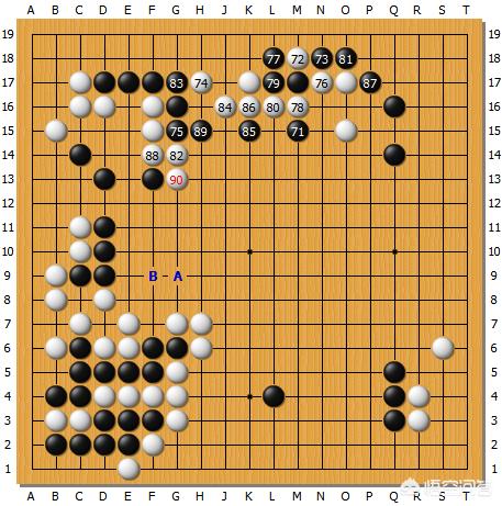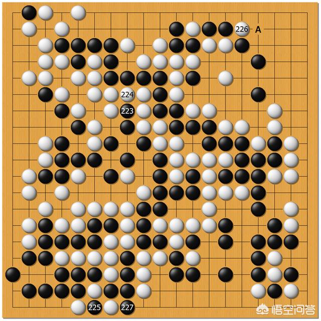 原来,柯洁看到了白226的劫财。黑棋不能让大龙死啊,所以左下消劫,但白在A位一长,右上又崩了......