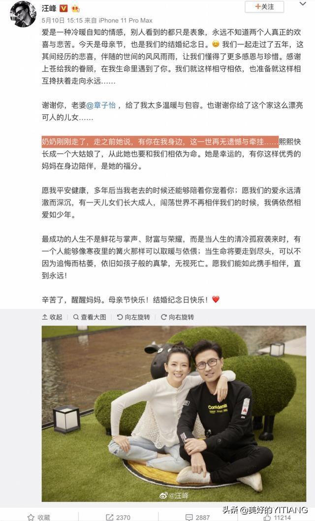 5月10日是母亲节,很多明星都发文感恩母亲,汪峰也不例外,不过他是发长文表白妻子章子怡,纪念结婚五周年,深情表白章子怡:愿我们能永远携手相伴 。照片中两人盘腿坐在地上,章子怡搂着汪峰的肩膀,尽显温馨。章子怡写道:“结婚纪念日和母亲节在一天,我是有多幸福。谢谢老公和孩子们!感恩,爱情与亲情一直守护着我们!”就在配文中汪峰曝光了母亲临终遗言,老人家在走的时候无牵无挂也没有遗憾,感觉这一辈子都是章子怡的功劳,老人家还对汪峰说道:“有章子怡在你身边这一世无遗憾和牵挂。”