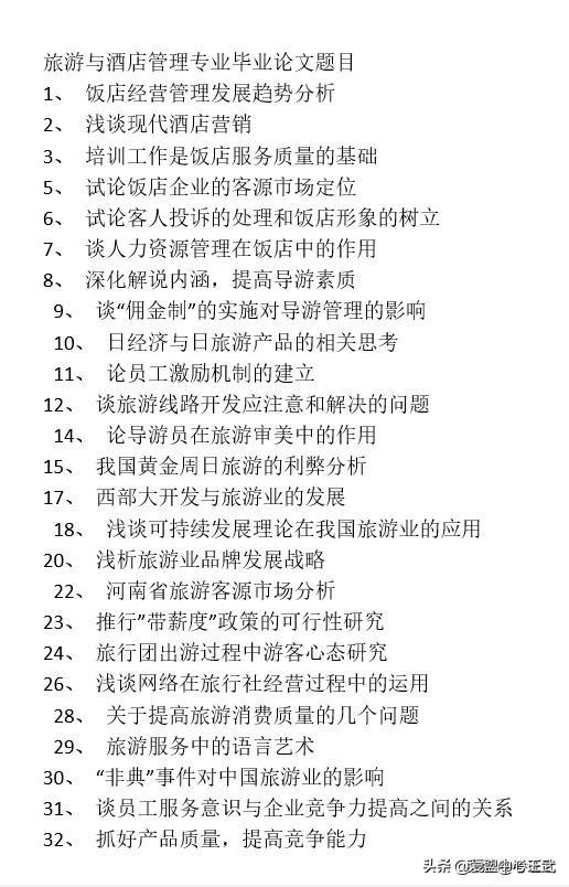旅游管理专业毕业论文题目怎么设计?有什么好的建议? spider 更新于 2023-07-24 00:03:15 全部 1021 旅游管理专业毕业论文题目怎么设计?有什么好的建议? 回复 共1条回复 我来回复 爱盟中心王武 这个人很懒,什么都没有留下~ 评论 建议你在下面这些题目中间,在选择自己的研究方向和现有资源结合的情况下,再结合现在的热点或者是未来的趋势,写自己的论文可能会更好,比如说论5g技术在酒店的应用 赞同 2019-10-29 22:47:41 0条评论 请 登录 或者 注册 后回复。