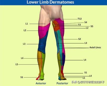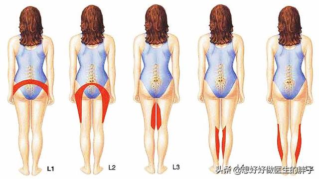 而根据腰椎不同部位的问题,会诱发不同部位的症状,大家看下图就会基本明白不同位置的神经根出现了炎症以后疼痛的大致范围。