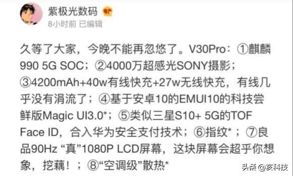 V30距离发布会已经很近了,但目前的已知的信息是麒麟900+外挂5G基带,采用的还是LCD打孔屏,支持侧面指纹识别。由此可见荣耀的重心是放在5G,在其他的升级上还略显保守。