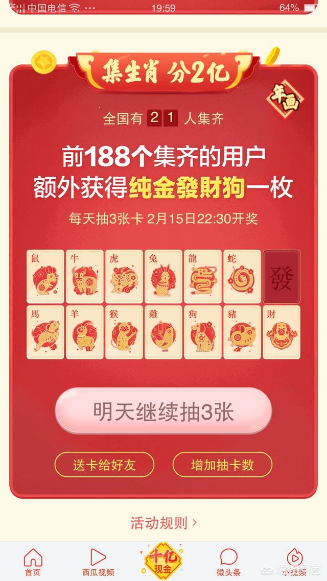 看到前188名集齐福卡的给一只纯金发财狗,想必大家都挺激动的然后尽力集福卡。在我回答问题时,暂时只有十六人拿到了,中午想起来了今日头条的红包活动什么的,然后我就开始集了,下图是我今天的成果,然后看头条里大部分人还是没集齐,又看到今日头条说在新农商网回答问题满100字会给五张不一样的福卡,过来试一下。