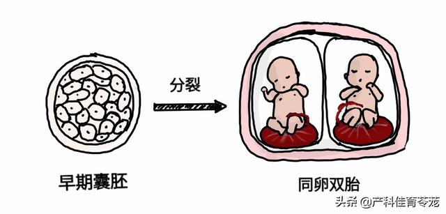 一个卵子受精后,在受精后3天内,也就是桑葚期就发生分裂,也会形成两个独立的受精卵,有各自的胎盘,但两个宝宝的性别、血型肯定是一样的,而且长得也一样。