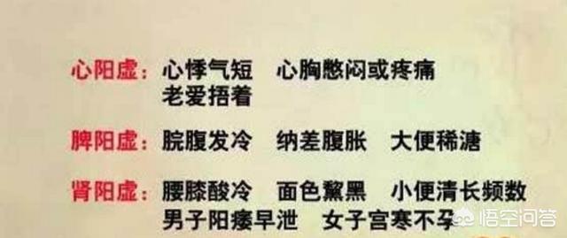 2、 肾阳虚:头晕目眩,面色恍白,腰膝冷痛,畏寒肢冷,四肢发凉,嗜睡,五更泄泻,久泻不止,完谷不化,小便清长,夜尿增多,男子阳痿早泄,女子闭经、不孕,带下量多,舌淡苔白,脉沉迟无力。