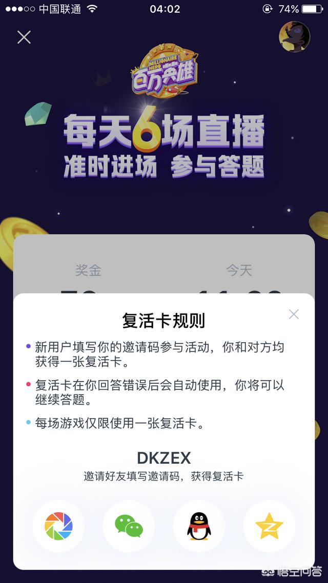 大家如果闲来无事可以尝试一下答题,赚不赚钱不要紧,多点学问总是没错的!新用户可以输入DKZEX获得复活卡一张!小编昨晚就是凭借一张复活卡拿到了奖金!还在等什么?还不快去答题!